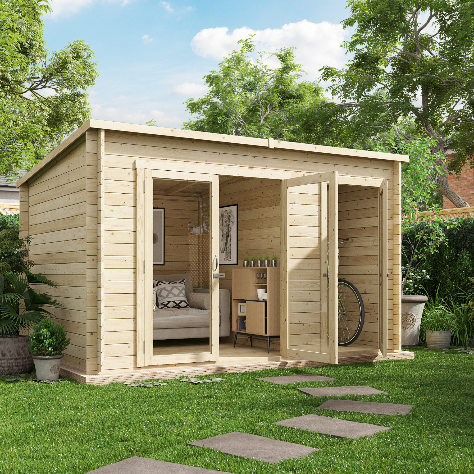 The 12 x 8 BillyOh Tianna Log Cabin Summerhouse has a modern pent design and long windows, which look fantastic in any contemporary garden setting. This stylish summer house has multi-purpose uses, with a spacious main space and a side storage unit attached to the side of the building. It’s great for storing all your gardening items and equipment in one place, safely out of sight.