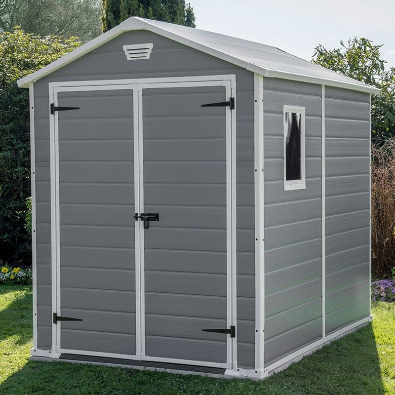 Offering you attractive, long-lasting, low-maintenance garden storage, the 6 x 8 Keter Manor Plastic Garden Shed (1.86m x 2.37m) is perfectly designed for a busy, modern garden.A Strong and Stylish ShedRobust, durable and supplied with a superb 15-year limited warranty, this premium plastic shed is expertly built from double-wall resin panels. Featuring an eye-catching wood-effect finish, this garden shed strikes the perfect balance between beauty and brawn.The tough resin floor will easily accommodate your heavier stored items, while the apex roof boasts a snowload capacity of 75kg/m² (15lbs/ft²), ensuring complete weatherproof protection for all your stored items.Great for Garden StorageYou can gain easy access via wide double doors, which are fitted with sturdy metal hinges and a pad bolt, so rest assured that your valuable tools will remain secure (padlock not included).Once inside, you’ll find the single window allows plenty of natural light to filter into the shed – ideal if you’re depositing items or carrying out DIY. This window can be installed in a variety of positions – the choice is yours.A high roof offers you plenty of headroom and increases your garden storage options, while strategically-placed air vents prevent condensation and keep your equipment in optimal storage conditions.A Tough, Hassle-Free ShedThis plastic shed comes with clear instructions to help you achieve a straightforward assembly. No cutting, sawing or specialist tools are required. You should secure the shed to a concrete or paved base to keep it stable in adverse weather conditions.When you unpack this shed, the panels might appear lightweight but they are incredibly robust and durable. Resistant to denting, fading, peeling and rot, this plastic shed really will withstand whatever life throws at it and maintain both its looks and effectiveness for years to come.Furthermore, the whole shed is near maintenance free, saving you money and leaving you more time to enjoy your garden.Choice of Sizes and Free DeliveryThis plastic garden shed is available in a choice of sizes.Delivery is free to most UK postcodes.Superb 15-year warrantyBuilt from double-wall resin panelsIncludes tough resin floorDouble doors feature metal hinges and padlock fixing (padlock not supplied)Window can be fitted in various positionsAir vents to optimise storage conditionsStraightforward assembly – no specialist tools neededNear maintenance freeChoose from different sizesFree delivery to most UK postcodes