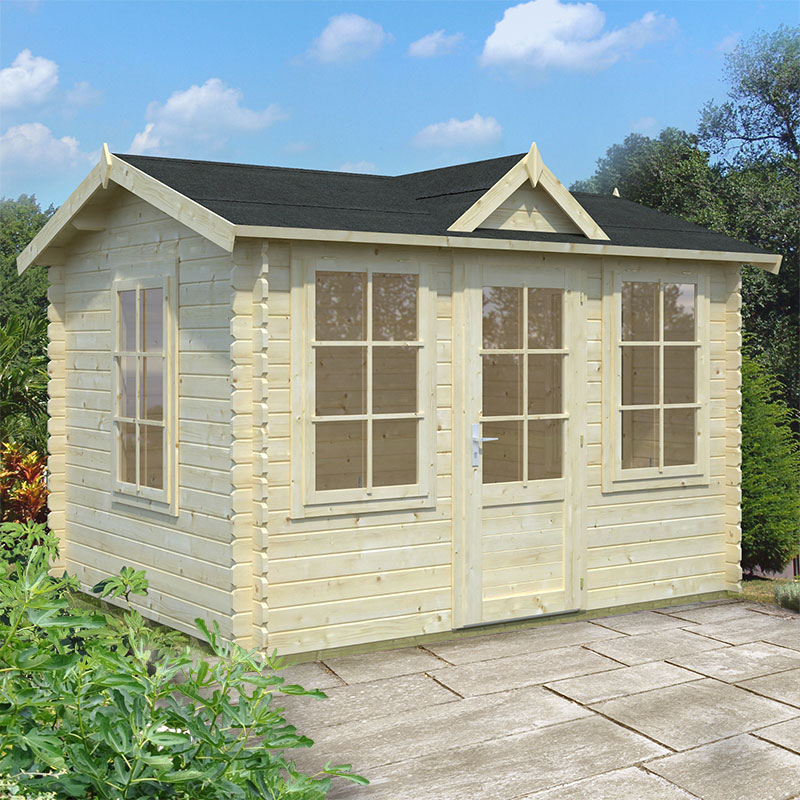 For an idyllic garden retreat in which to relax or entertain your friends, buy the Palmako Claudia 3.2m x 2.4m Log Cabin Summer House (28mm). This garden building sports an attractive pavilion-style design and boasts a number of impressive features, making it a wonderful venue for any outdoor occasion. Expertly built from superior, interlocking 28mm Nordic spruce logs, with a chalet-cut design and added wind braces, this premium log cabin offers you and your possessions exceptional all-round weatherproof protection. Both the floor and roof are constructed from 19mm tongue and groove cladding, renowned for its robustness, durability and resistance to the elements. The former is supported by pressure treated foundation joists to protect the interior from ground moisture, while the latter’s reverse apex design provides you with increased headroom and the opportunity to house taller items. Please be advised that the roof does not include a covering. You should choose one from the available optional upgrades. Select from SBS, EPDM, Charcoal Felt Shingles or Roof Felt Underlay. (SBS weatherproof roof covering is a thick, torch-on felt with an exceptionally long lifespan and outstanding weatherproof qualities. Unless you possess advanced DIY skills, we recommend hiring a professional installer. Long-lasting EPDM weatherproof roof covering is a robust, reliable, watertight rubber cover. Fixings and adhesives are not supplied. Unless you possess advanced DIY skills, we recommend using a professional installer. Heavy-duty Charcoal Felt Roof Shingles are a permanent weatherproof roof covering, which is attractive, easy to instal and extremely durable. Roof Underlay Felt is simple to nail on to the garden building but is only designed as a temporary solution until you have added a permanent weatherproof roof cover upgrade.) The partially-glazed single door offers you easy access to the interior and is fitted with safety glass, which is always a good idea in a busy garden. This door also features a laminated frame, to keep out draughts and prevent the warping and cracking caused by changes in temperature, as well as a stainless-steel sill cover, which prevents the timber wearing down after heavy usage. When you’re not at home, a key-operated cylinder lock offers you the reassurance that your valuable items are completely safe from unwanted attention. With the addition of 4 large, opening windows, positioned on 3 sides of the garden building, you’ll find this summer house incredibly light, airy and beautifully ventilated on a hot summer’s day. This log cabin is delivered untreated. You should apply a quality wood preservative upon assembly and annually, thereafter, in order to maintain the timber’s attractive appearance, ensure its weathertightness and validate the guarantee. For a more individual style, why not apply paint instead? This stylish garden cabin is available in a range of sizes. Supplied with a reassuring 5-year guarantee, it includes a full installation kit to help you achieve a straightforward assembly. Free delivery is available to most UK addresses. Built from superior 28mm Nordic spruce interlocking logs Added wind braces and a chalet-cut design for superb weatherproof protection 19mm tongue and groove floor 19mm tongue and groove roof Roof cover not included – please select from roof cover options above Partially-glazed single door fitted with safety glass, a laminated frame and stainless-steel sill Key-operated cylinder lock for added security 4 large, opening windows Reassuring 5-year guarantee Supplied untreated – treat or paint to validate the guarantee Free delivery to most UK addresses