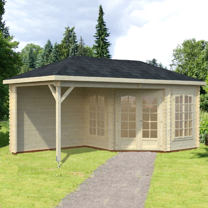 Including a versatile sheltered porch area, the Palmako Melanie 5.7m x 3m Corner Log Cabin Summer House (28mm) makes a marvellous garden retreat, suitable for relaxing with your family or entertaining friends. Expertly built from superior, interlocking 28mm Nordic spruce logs, with added wind braces and a chalet-cut design, this premium log cabin offers you and your possessions exceptional all-round weatherproof protection. Both the 19mm floor and 16mm roof are constructed from tongue and groove cladding, renowned for its robustness, durability and resistance to the elements. The former is supported by pressure treated foundation joists to protect the interior from ground moisture, while the latter’s eye-catching design is certain to draw admiring glances from your friends. Please be advised that the roof does not include a covering. You should choose one from the available optional upgrades. Select Charcoal Felt Shingles. (Heavy-duty Charcoal Felt Roof Shingles are a permanent weatherproof roof covering, which is attractive, easy to instal and extremely durable.) The partially-glazed double doors offer you easy access to the interior and are fitted with safety glass, which is always a good idea in a busy garden. These doors also feature a laminated frame, to keep out draughts and prevent the warping and cracking caused by changes in temperature, as well as a stainless-steel sill cover, which prevents the timber wearing down after heavy usage. When you’re not at home, a key-operated cylinder lock offers you the reassurance that your valuable items are completely safe from unwanted attention. With 2 large, opening windows, this garden room provides plenty of natural light and ventilation, which is ideal when you’re relaxing inside on a summer’s day. These windows are fitted with rubber/ silicone seals, so protect the interior from draughts and improve insulation when the weather’s not so pleasant. This log cabin is delivered untreated. You should apply a quality wood preservative upon assembly and annually, thereafter, in order to maintain the timber’s attractive appearance, ensure its weathertightness and validate the guarantee. For a more individual style, why not apply paint instead? This stylish summer house is available for you to buy in a variety of shapes and sizes. Supplied with a reassuring 5-year guarantee, it includes a full installation kit to help you achieve a straightforward assembly. Free delivery is available to most UK addresses. Built from superior 28mm Nordic spruce interlocking logs 19mm tongue and groove floor 16mm tongue and groove roof Roof cover not included – please select from roof cover options above Partially-glazed double doors fitted with safety glass, a laminated frame and stainless-steel sill Key-operated cylinder lock for added security 2 large, double-glazed, opening windows Reassuring 5-year guarantee Supplied untreated – treat or paint to validate the guarantee Free delivery to most UK addresses